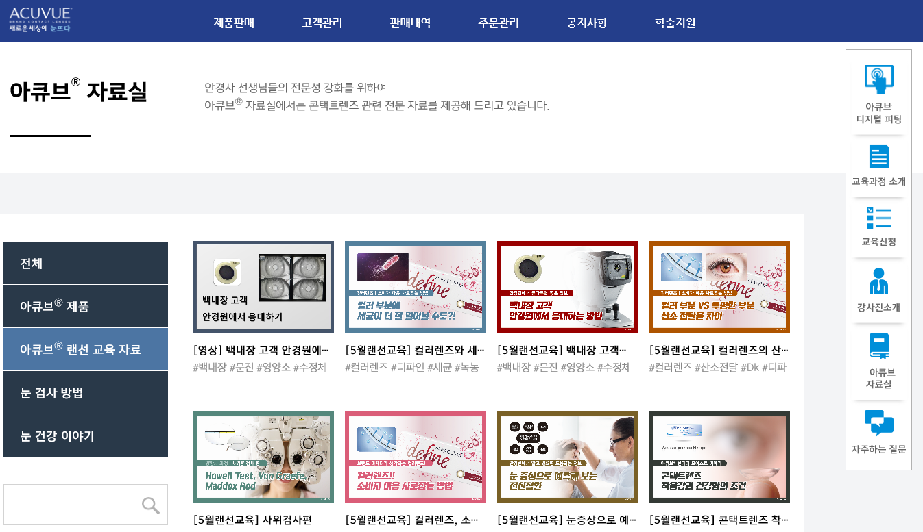 △아큐브 모이스트 멀티포컬 피팅 가이드 △조절근점.폭주근점 검사편 △양안균형검사편 △감각성 우위안 검사편 △가입도검사편 △유일하게 혈관을 바로 볼 수 있는 기관, 눈 △근시진행, 두고만 볼 것인가? △근시 진행을 늦추는 방법들 △드림렌즈, 정말 꿈 속의 렌즈인가 △2018 American Academy of Optometry Meeting에 다녀오다 △안경사의 자긍심과 소명의식 △디지털 세대의 눈은 안전한가? △아큐브 오아시스 원데이-재질편 △아큐브 모이스트 멀티포컬-디자인 소개편 △아큐브 모이스트 멀티포컬-추천요소 편 △아큐브 오아시스 원데이-문진편 △아큐브 비타-문진편 △아큐브 비타-재질편(팩트체크) △아큐브 오아시스 원데이-대비감도편 △눈물층의 역할 △오아시스 원데이-난시렌즈 디자인편 △오아시스 원데이-난시용 콘택트렌즈 안정화 디자인(자세편) △JCC검사방법 △오아이스 원데이-ASD디자인 이야기 △BTT 검사방법 △자외선 차단, 피부만큼 눈도 중요하다 △ARK로 하는 간단한 난시검사 △난시검사의 정석-최대구면굴절력편 △난시검사의 정석-난시검사편 △난시검사의 정석-마무리검사편 △ACUVUE OASYS with TRANSITIONS 데모 기기 사용법 △영.유아기 시기능 발달 △초등학생 눈검사 △황반변성편 △예비검사 △easy 노안검사법 △조절,폭주검사편 △각막편 △ARK 활용편 △노안검사 전 체크 point △백내장 수술 후 검안 팁 △커버테스트편 △오아시스원데이, 딱 한문장으로 사로잡기 △콘택트렌즈 재질안에 숨어있는 스토리-모이스트 △콘택트렌즈 착용감과 건강함의 조건-모이스트편 △브랜드 마케터가 소개하는 모이스트 이야기 △딱 한문장으로 고객마음 사로잡기-오아시스원데이편 △구면.난시검사편 △노화로 나타나는 안구의 변화편 △조절용이성편 △눈물(건성안)편 △양안균형검사편 △콘택트렌즈 착용감과 건강함의 조건-모이스트편 △눈증상으로 예측해보는 전신질환 △컬러렌즈, 소비자 마음 사로잡는 방법 △사위검사편 △컬러렌즈의 산소전달율 △백내장 고객 안경원에서 응대하는 방법 △컬러렌즈와 세균오염 △백내장 고객 안경원에서 응대하는 방법 등 약 70여개가 업데이트 돼 있다.