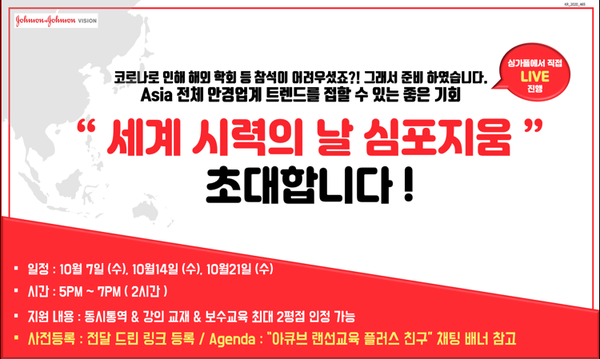 한국존슨앤드존슨 비젼(대표 이선영) 아큐브 교육센터(JJI)에서 아시아퍼시픽 아큐브 학술팀이 진행하는 심포지엄에 안경사의 참여를 독려하고 나섰다. 이번 심포지엄은 '세계 시력의 날에 대한 감사'라는 주제로 진행되며 아시아의 안경산업 전반과 트렌드를 접할 수 있는 좋은 기회가 될 것으로 보인다.