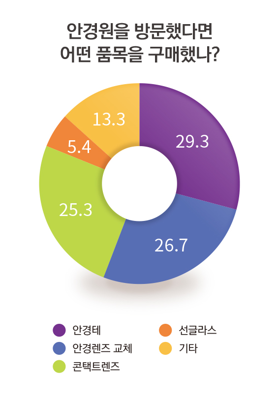 이번 설문조사에서 '재난지원금으로 안경원을 방문해 사용한 경험이 있습니까'라는 질문에 25.5%만이 경험이 있다고 답했다. 안경원을 방문하지 않은 74.5%의 절반 수준도 안되지만 꽤 많은 고객이 소중한 재난지원금을 안경을 맞추고 콘택트렌즈를 구매하는데 사용한 것이다. 구매한 품목을 묻는 질문에 29.3%가 안경테라고 답했다. 이어 26.7%가 안경렌즈 교체, 25.3%가 콘택트렌즈, 5.4%가 선글라스라고 답했다.