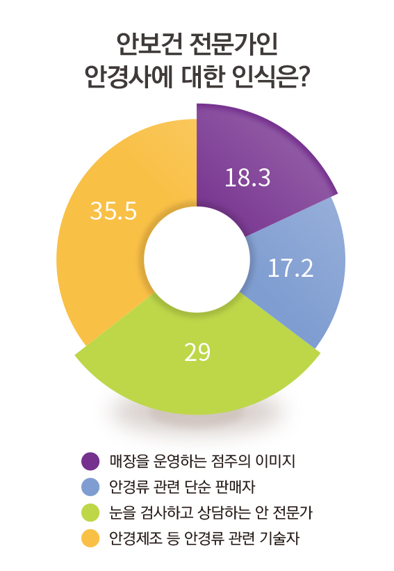 그렇다면 소비자들은 안경사에 대해 어떤 이미지를 갖고 있을까. 물론 예전보다는 많이 좋아졌지만 아직도 선생님이라는 호칭을 붙이는 경우는 드물다. 안경원보다 안경점으로 부르는 등 단순히 안경류 물품을 판매하는 곳이라는 인식이 아직까지 자리잡고 있기도 하다. '안경사는 국가면허를 취득한 안보건 전문가입니다. 안경사에 대한 여러분 인식은 어떻습니까'라고 질문을 던졌다. 가장 많이 응답한 항목은 '안경제조 등 안경류 관련 기술자'로 35.5%의 응답률이다. '눈을 검사하고 상담하는 안 전문가'가 29%로 그 뒤를 따랐다. '매장을 운영하는 점주의 이미지'가 18.3%, '안경류 관련 단순 판매자'가 17.2% 등 반갑지 않은 응답률도 적지 않았다.