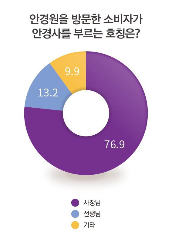 호칭에 있어서도 더 많은 개선이 필요해 보인다. 아저씨 혹은 아주머니로 부른다고 답한 응답자는 다행이 없었다. 다만 아직도 사장님이라고 부르는 경우가 과반수를 훌쩍 넘긴다. 76.9%의 응답자가 선생님 대신 사장님으로 안경사를 부른다고 답했다. 선생님이라는 호칭을 쓰는 응답자는 13.2%에 불과했다. 기타 9.9%는 특별한 호칭을 붙이지 않거나 "저기요" 등으로 부른다고 볼 수 있다.