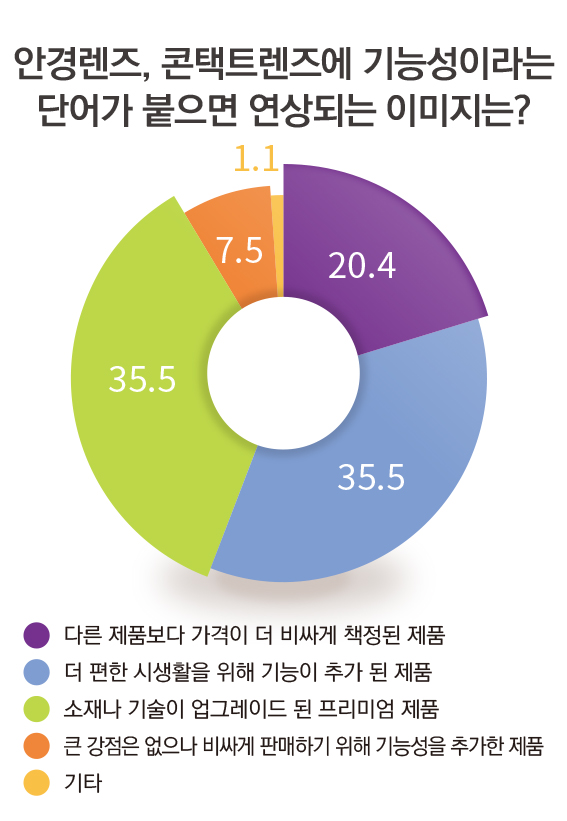 단순히 이름만 들었을 때 소비자들은 기능성렌즈에 대해 어떻게 생각할까. 35.5%가 '더 편한 시생활을 위해 기능이 추가된 제품', 35.5%가 '소재나 기술이 업그레이드 된 프리미엄 제품'이라고 답했다. 전체 응답자 중 71%가 기능성렌즈에 대해 아주 긍정적으로 생각하고 있었다. 반면 부정적인 인식도 있다. '다른 제품보다 가격이 더 비싸게 책정된 제품' 혹은 '큰 강점은 없으나 비싸게 판매하기 위해 기능성을 추가한 제품'도 각각 20.4%, 7.5%로 응답했다. 물론 긍정적으로 생각하는 소비자가 월등히 많지만 부정적인 소수 의견도 무시할 수는 없다. 단순히 비싸게 판매하기 위해서라는 편견을 깨고 조금 더 편한 시생활을 돕는 기능성 제품으로 각인시키는 작업이 필요할 것으로 보인다.