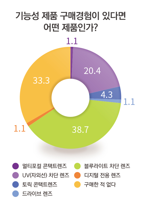 그렇다면 소비자들이 직접 구매해본 기능성 제품은 무엇일까. 블루라이트 차단렌즈가 38.7%, 자외선 차단 렌즈가 20.4%, 토릭 콘택트렌즈가 4.3%, 드라이브렌즈.멀티포컬 콘택트렌즈.디지털 전용 렌즈가 각각 1.1%로 나타났다. 역시 근적외선 차단 렌즈를 구입한 고객은 없었다. 일부 안과의사나 매체에서는 블루라이트의 위험성이 과도한 공포마케팅이라고 주장하기도 했다. 이 때문에 의견이 분분하기도 했지만 블루라이트 차단 렌즈를 써 본 고객들은 어느정도 만족한다는 경험 후기를 공유하기도 했다. 불과 몇 년 전만 해도 블루라이트 차단에 대한 중요성을 느끼지 못했을뿐더러 해당 제품을 구매해야 하는 것에 의문을 느꼈을 정도다. 그러나 기능성 제품 중에 블루라이트 차단 렌즈를 제일 선호하고 있는 것을 보면 기능성렌즈 시장의 무긍무진한 가능성을 엿보이게 한다. 안경렌즈부터 콘택트렌즈까지 블루라이트 차단이 대세가 된 것이다.