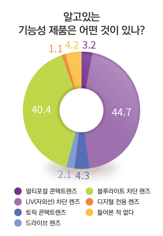 최근에는 디지털기기와 밀접한 라이프스타일로 인해 모니터에서 방출하는 블루라이트가 시력에 좋지 않다는 사실이 알려지면서 블루라이트 차단 안경에 대한 관심이 높아졌다. 이를 반영하듯 대다수의 소비자들이 블루라이트 차단 제품을 대표적인 기능성렌즈로 꼽았다. 이어 토릭렌즈가 4.3%, 멀티포컬 콘택트렌즈가 3.2%, 드라이브렌즈가 2.1%, 디지털전용렌즈가 1.1%로 집계됐다. 들어본적 없다고 응답한 소비자도 4.2%였다. 설문 문항에는 근적외선 차단렌즈도 포함돼 있었으나 응답자 중 이 제품을 알고 있다고 체크한 소비자는 없었다. 출시되기 시작한 시기가 얼마되지 않았고 아직은 생소한 제품이기 때문에 더 많은 홍보가 필요할 것으로 보인다.