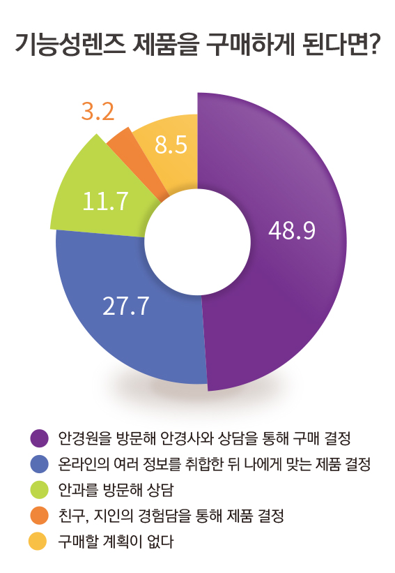 기능성렌즈를 구매하게 된다면 소비자들은 어떤 경로를 통해 구매하고 싶을까. 48.9%가 '안경원을 방문, 안경사와 상담을 통해 구매'하겠다고 밝혔다. 반면 11.7%는 '안과를 방문해 상담'하겠다고 답했다. 안경사보다 안과의사가 더 전문적이라는 인식은 차치하고라도 안경렌즈와 콘택트렌즈 분야에 있어서는 안경사가 더 많은 솔루션을 제안해줄 수 있다는 점을 소비자에게 강조해야 한다. 많은 안경사들이 최신식 기기를 갖추고 주기적으로 제품 동향 및 세계 트렌드에 대해 공부하고 있다. 또 전문적인 검안으로 니즈에 잘 부합하는 제품을 명확하게 추천해주기도 한다. 비전문가의 조언을 듣겠다는 소비자들도 있었다. 29.7%가 '온라인의 여러 정보를 취합한 뒤 나에게 맞는 제품 결정', 3.2%가 '친구, 지인의 경험담을 통해 제품 결정'하겠다고 답했다. 8.5%는 여전히 기능성렌즈에 대한 관심도 구매 계획도 없는 것으로 나타났다. 구매를 계획하고 있는 대다수의 고객을 잡는 것도 중요하지만 관심없는 8.5%의 고객을 확보하는 것도 과제 중 하나다.