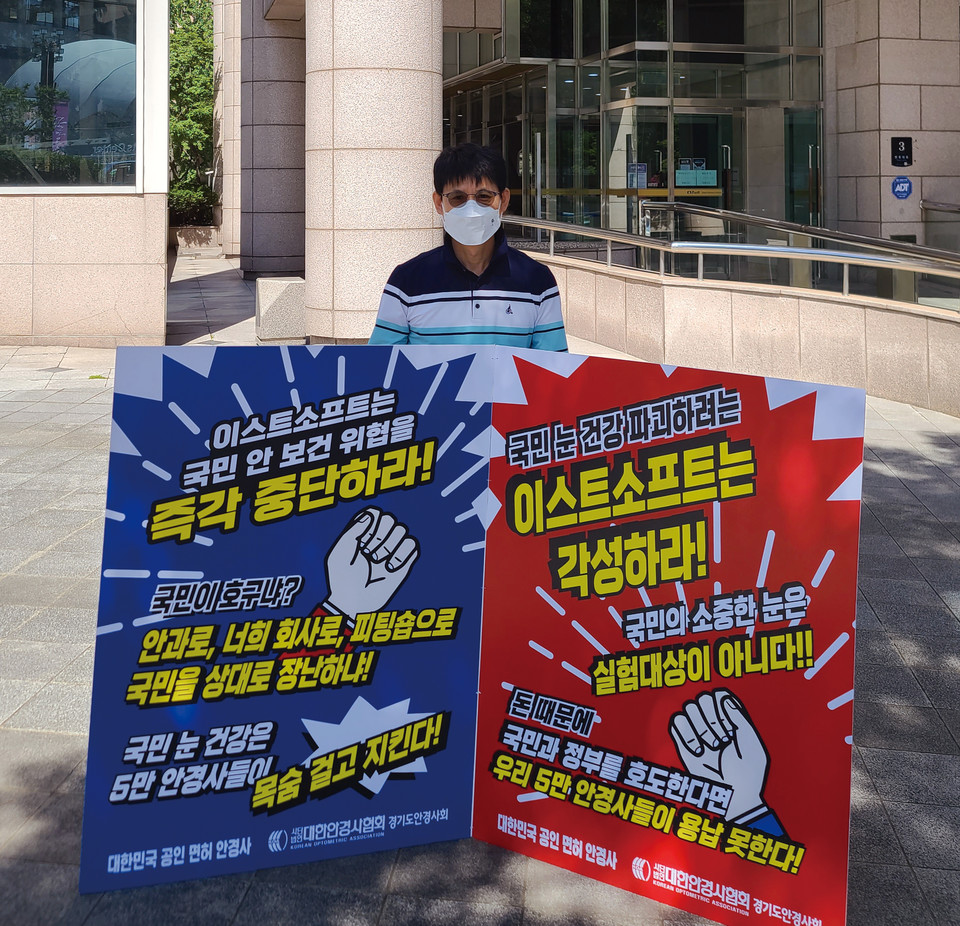 경기도안경사회는 도수안경 온라인 판매 추진 논란 당사자인 모 회사 이스트소프트 본사 앞에서 임원들을 주축으로 1인 시위를 벌이고 있다. 특히 폭염경보가 내려진 무더운 날씨에도 불구하고 땀을 연신 닦아가며 시위에 참여하고 있다는 후문이다.