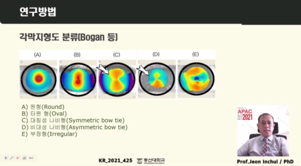 교육 세션에서는 스피커로 나선 인물들에게 질문하고 그에 대한 답을 듣는 형식으로 진행됐다. 첫 번째로 동신대학교 안경광학과 전인철 학과장에게 '약도의 난시를 갖고 있는 사람에게 구면등가 vs 토릭렌즈 피팅'과 '약도 난시가 있는 사람에게 어떤 피팅이 가장 적합하다고 생각하나' 등 두 가지를 질문했다. 전인철 교수는 "2019년 대한시과학회 논문을 응용하자면 난시 0.75~1.75 상태에서 구면렌즈, 토릭렌즈를 각각 처방했을때 각막지형도와 시력을 비교했다. 구면렌즈는 시력이 대략 0.85 정도로 나왔고 토릭렌즈를 처방했을 때 1.0에 가깝게 나왔다"며 "토릭렌즈로 교정할때 각막지형도와 원형비율, 교정시력이 증가했다. 착용자 시력의 질 향상을 위해서는 저난시 소비자도 토릭렌즈로 처방하는 것이 바람직하다"도 답했다. 이어 그리스 논문을 응용하며 "굴절이상자 중 난시를 가진 사람이 61%인데 이중 47.3%가 약도 난시다. 약도 난시에서는 시각 왜곡, 두통, 눈피로 등의 증상이 더 잘 나타난다. 편안한 시각을 위해서는 토릭렌즈 교정이 훌륭한 솔루션이다"고 강조했다.