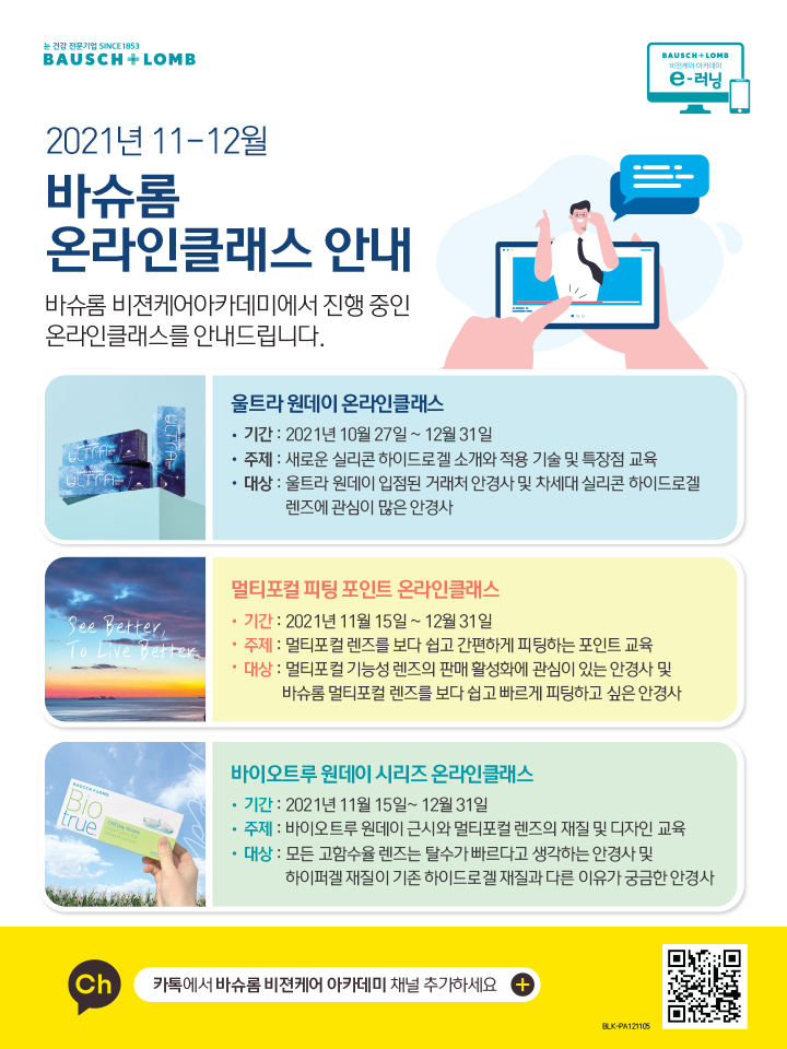 한편 온라인 클래스에 대한 자세한 소개 및 신청은 카카오톡에서 '바슈롬비젼케어아카데미'를 검색해 채널 내에서 확인 가능하며, 신청은 각 온라인클래스 교육 소개 포스트에서 하면 된다.