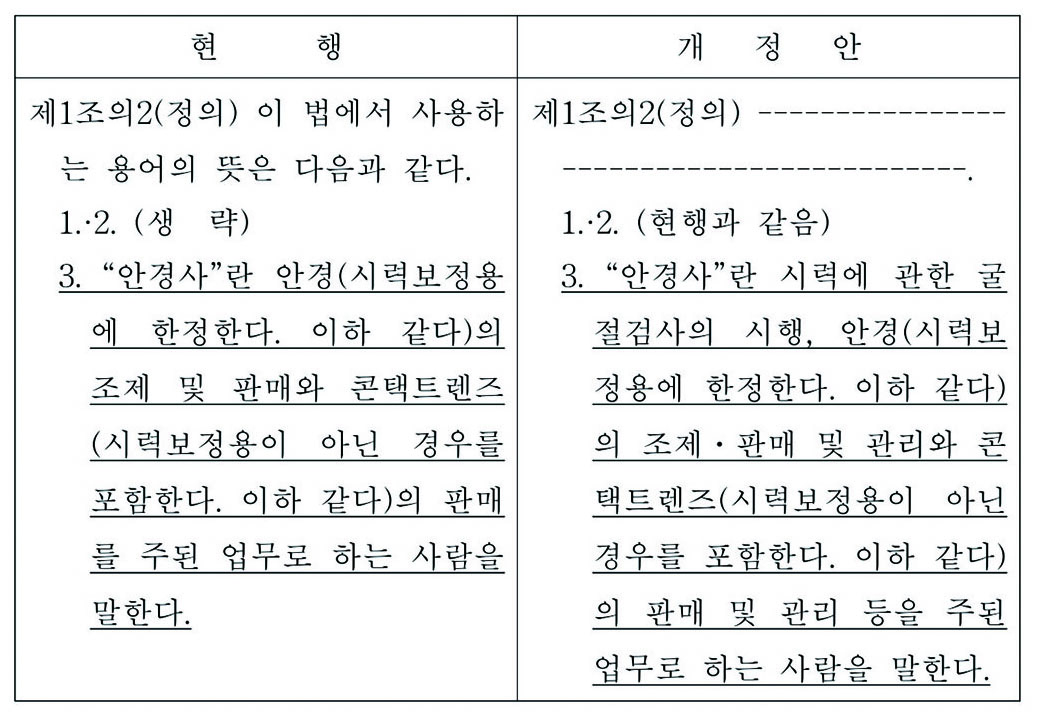 하지만 현행법상 안경사의 업무 범위에 시력에 관한 굴절검사 업무가 포함되어 있지 않고, 안경사가 안경 및 콘택트렌즈의 판매 외에 관리 업무도 함께 수행하고 있음에도 안경 등의 판매만을 주된 업무로 명시한 현행법이 실제 안경사의 업무를 적절하게 반영하고 있지 못하다고 지적했다. 이에 현행법 시행령에 따른 시력에 관한 굴절검사 업무와 안경·콘택트렌즈의 관리 업무를 법률상 안경사의 업무 범위에 명시적으로 규정함으로써, 안경사의 업무 범위를 명확히 하려는 것임을 강조했다.