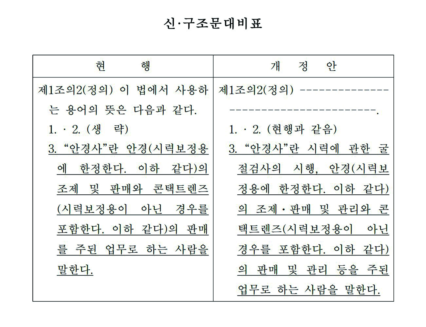이번 개정안 내용을 살펴보면 의료기사 등에 관한 법률 제1조의2제3호, 안경사 정의 부분으로 ‘안경사란 시력에 관한 굴절검사의 시행, 안경(시력보정용에 한정한다. 이하 같다)의 조제‧판매 및 관리와 콘택트렌즈(시력보정용이 아닌 경우를 포함한다. 이하 같다)의 판매 및 관리 등을 주된 업무로 하는 사람을 말한다’ 로 명시해 안경사 업무범위를 굴절검사와 안경‧콘택트렌즈의 관리까지 확대해 규정했다.