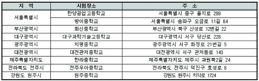 서울 지역은 한양공업고등학교, 방이중학교에서 실시되며, 부산은 화신중학교에서 치러진다. 대구는 대구과학기술고등학교에서 실시하며, 광주는 치평중학교에서 시험을 치른다. 대전은 대전 관저중학교, 제주도는 한라중학교, 전북은 전주시 전주우아중학교, 강원도는 원주시 원주 중학교에서 각각 치러진다.