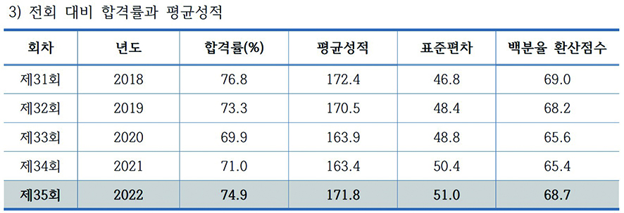 지난 안경사 국시합격률은 2018년도 31회차에 합격률이 76.8%, 2019년 32회차에 73.3%, 2020년 33회차에 69.9%로 하락했다. 이듬해인 2021년 34회차에 71.%, 2022년 35회차에 74.9%로 다시 합격률이 오르는 추세다.