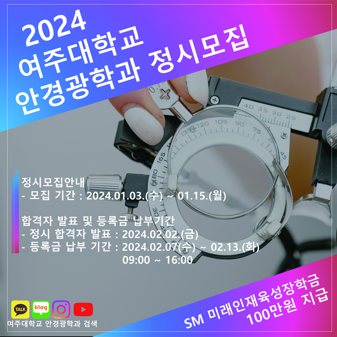 국민의 시기능 보호와 시력관리에 필요한 과학적이고 체계적인 지식과 기술 습득으로 눈 보건전문가를 양성하는 여주대학교 안경광학과(학과장 정미아)가 2024학년도 정시 모집을 오는 2024년 1월3일부터 1월15일까지 실시한다.