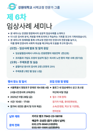 강원대학교 시력교정 전문가 그룹이 이달 28일 제6차 임상사례 세미나에 참가할 안경사를 모집한다.서울 문래동 서울시안경사회 교육센터(문래로 164 B동 4층)에서 진행되는 이번 세미나는 임상사례 발표와 주제토론 및 실습 등 오전과 오후로 나뉘어 진행된다.6차 세미나 오전에 열리는 임상사례 발표는 한신호 강사의 ‘임상굴절검사에서 나타나는 반응편향의 대응전략’과 정기성 강사의 ‘프리즘과 가입도 조정의 임상적 접근:외사위 노안 환자 처방 사례’라는 주제로 진행되며, 오후에는 조현국 교수의 ‘굴절이상 원시의 검사와 교정’이라는 주제로 열린