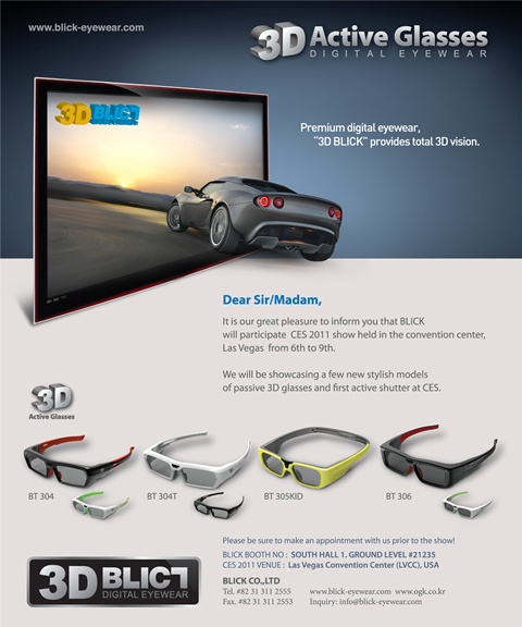삼성의 3d 안경을 제작하고 있는 블릭(대표 황창호)이 내년 1월 6일부터 9일까지 라스베가스 ces 2011에 참가한다. 블릭은 새로운 스타일의 패시브 3d 안경과 셔터글라스 3d 안경을 출품할 계획이다. 세계 주요 전자업체들이 각종 첨단 전자제품을 선보이는 ces는 1967년 첫 개최된 이후 매년 2,000여 개에 달하는 업체가 참가하고, 10만 명이 넘는 참관객이 모여들어 그 권위를 인정받고 있다.