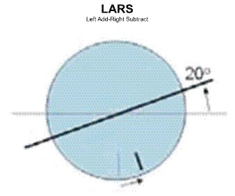 lars 법칙은 난시 콘택트렌즈 처방시 난시축 회전으로 인해 난시축 재교정이 필요할 경우 사용되는 간단한 법칙이다. 난시축 식별마크의 오른쪽과 왼쪽 위치 기준은 안경사를 기준으로 진행하면 된다. 난시축 식별마크가 6시 방향에 있는 제품을 착용하고 난시축 식별마크가 안경사가 바라보는 위치에서 7시 방향에 있다면 왼쪽으로 움직인 것이며, 5시 방향에 있다면 오른쪽으로 이동한 것으로 예상할 수 있다. lars법칙에서 left addition 움직인 축만큼 더하고, right subtract 움직인 축만큼 빼서 난시축을 재교정을 하면 된다.
