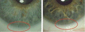 난시축 식별마크 위치 확인(왼쪽 사진) 난시 콘택트렌즈 착용시 올바른 위치에 있는 난시축 식별마크 (오른쪽 사진) 오른쪽으로 15도 정도 난시축 식별마크가 움직인 사진(contact lens spectrum, volume : 27, issue : june 2012, page(s) : 28 - 32 )