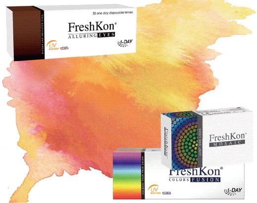프레쉬콘은 원데이 컬러렌즈와 한달용 컬러렌즈 등 착용주기 및 컬러별, 디자인별로 다양한 제품군을 보유하고 있으며, 트렌디한 컬러패턴과 함께 착용감이 좋아 젊은 여성층을 중심으로 큰 사랑을 받고 있다. 가을 날씨에 어울리는 프레쉬콘 컬러렌즈 3종인 모자익, 얼루어링 아이즈, 컬러 퓨전 제품에 대해 자세히 알아보자.