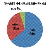 '아이엔샵을 이용하면서 거래처 확보에 도움이 되었나'라는 질문에 대한 응답으로 거래처 확보에 도움이 됐다는 업체가 27개사(64%), 보통이다 13개사(31%), 도움이 안 됐다라고 응답한 업체는 2개사(6%)였다. 아이엔샵에서 판매가 안경원 거래처 확보에 도움이 된다는 긍정적인 평가로 아이엔샵 운영이 입점업체들의 경쟁력에 많은 영향을 주고 있는 것으로 나타났다.