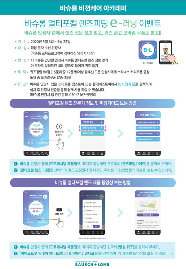 한편 현재 진행 중인 멀티포컬 렌즈 피팅 e-러닝 프로그램에 궁금한 점이 있거나 참여를 원하는 경우 바슈롬 교육팀 (070-7167-9922, 9927)으로 문의하면 된다.