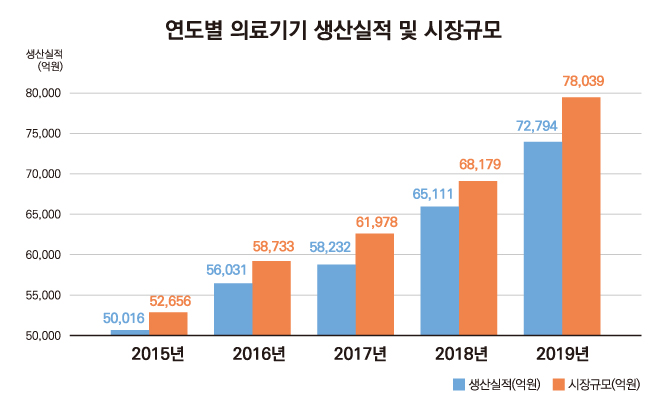 국내 의료기기 시장규모는 지난해 7조8000억원으로 지난 5년간 연평균 10.3%씩 확대되고 있다. 시장규모는 생산과 수입을 더한 뒤 수출금액을 뺀 금액으로 산출하고 있으며 원화 기준이다. 지난 2015년 5조2656억원에서 꾸준히 성장해 왔으며 2018년 6조8179억원에서 1년새 약 1조원 가까이 급성장한 것을 알 수 있다.