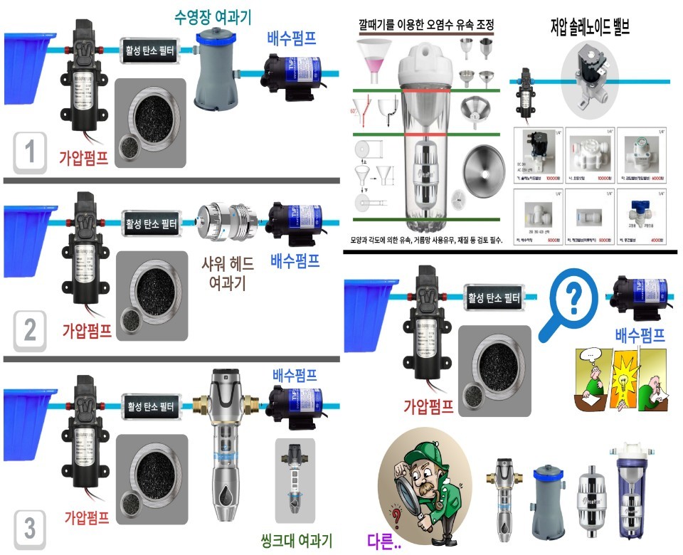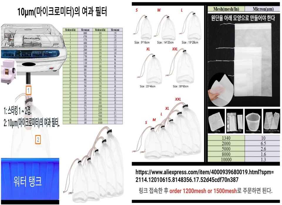여러 재료를 구할 수 있는 사이트를 공유한다. ▲나일론 메쉬 구입 사이트: 링크 접속한 후 order 1200mesh or 1500mesh(10㎛ 이하)로 주문하면 된다. (https://www.aliexpress.com/item/4000939680019.html?spm=2114.12010615.8148356.17.52d45cdf70n387) ▲샤워헤드 필터 구입(https://a.aliexpress.com/_dVnfabb) ▲주방 씽크대 여과기(https://a.aliexpress.com/_dXOWXTX) ▲가압펌프 (http://mitem.auction.co.kr/vip?itemNo=B405268320) ▲정수기 재료 구입(www.filter114.co.kr)