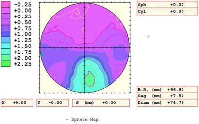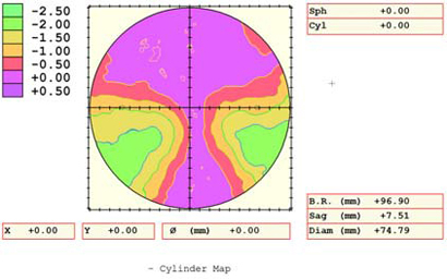 그런 다음 이미지처리 알고리즘을 이용하여 렌즈의 전체 부위에 걸친 광학적 특성을 계산하고 데이터 파일을 생성한다. 데이터 파일로부터 구면도수, 원주도수, 원주축 및 프리즘 도수에 대한 2차원 지형도를 생성하여 굴절력 분포를 분석할 수 있다.
