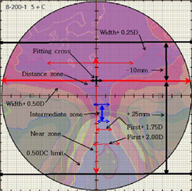 출력된 등가 구면도수 지형도와 등가 원주도수 지형도를 정확하게 중첩시켜서 원용부, 누진대 및 근용부의 명시범위를 밀리미터 자로 측정하였다. 그런 다음 출력된 지형도에서 좌우 수평기준점의 거리(실제 렌즈에서 34mm에 해당함)를 측정하고 환산계수를 구하여 각 측정값을 계산하였다. 누진대 주변부의 최대 비점수차량은 데이터파일로부터 얻었다.