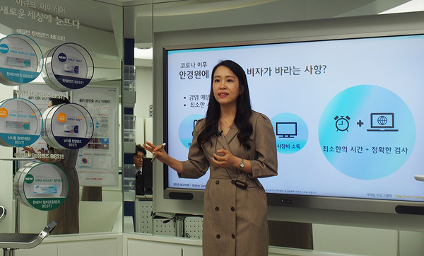 이어 이선영 대표는 "처음 겪는 코로나 상황으로 인해 많이 당혹스럽고 낙담하셨을 것으로 안다. 그동안 콘택트렌즈 카테고리는 꾸준히 성장해 왔는데 코로나로 인해 처음으로 역성장하는 6개월이었다. 안경원 비즈니스 역시 가장 어려운 시기였을 것이라고 짐작하고 있다"며 서두를 뗐다. 이 대표는 "저희 아큐브는 지난 6개월간 안경원과의 상생을 위한 다양한 이노베이션을 개발하고 발전시키는데 노력을 기울였다. 오늘 선보이는 '원터치 피팅 프로그램'은 그동안 축적된 데이터를 총망라했으며 현장에서 고군분투 중인 원장님 그리고 콘택트렌즈 담당 선생님들을 서포트하기 위해 내놓았다. 어려운 시장 속에서 원터치 피팅 프로그램이 안경원 매출을 성장시키는 마중물이 될 수 있도록 노력하겠다"고 강조했다.