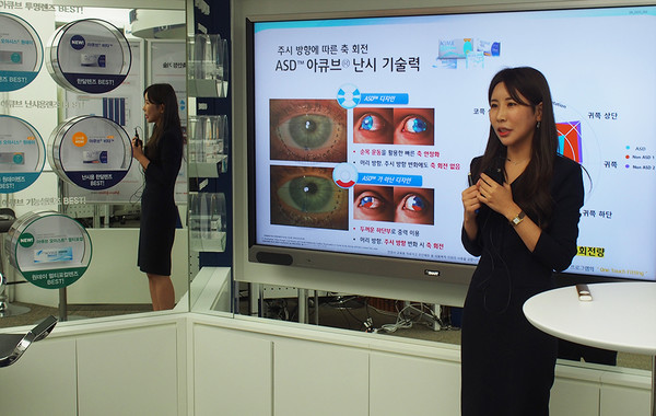 이어 교육팀 김송희 과장은 아큐브 난시렌즈의 ASD 기술에 대해 설명했다. TV를 보거나 핸드폰, 책을 볼 때 사람들은 자세를 계속 바꾸게 되는데 이때 축이 회전하면 시야가 흐려질 수 있다. ASD가 적용된 아큐브 난시렌즈의 핵심은 순목운동을 통해 축 안정이 빠르게 이뤄지며 주시방향이 변화해도 축 회전이 없다는 것이다. 김송희 과장은 "아큐브 난시렌즈 착용자의 92%가 1분 안에, 97%가 10도 이내로 축이 안정됐다고 느꼈다고 답한 만큼 아큐브의 독자적인 ASD 기술력의 우수함을 볼 수 있다"고 설명했다.