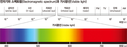 또한 전자기파 스펙트럼 (electromagnetic spectrum) 가운데 가시광선의 영역은 380에서 780nm 인데, 이중에 380에서 500nm 사이의 단파장 가시광선은 눈에 해로운 영향을 미치며, 특히나 망막 손상을 유발할수 있는것으로 알려져 있다. 또한 가시광선 가운데 가장 망막 손상을 일으킬수 있는 가장 해로운 파장의 영역은 대략 440nm 로 알려져 있다.