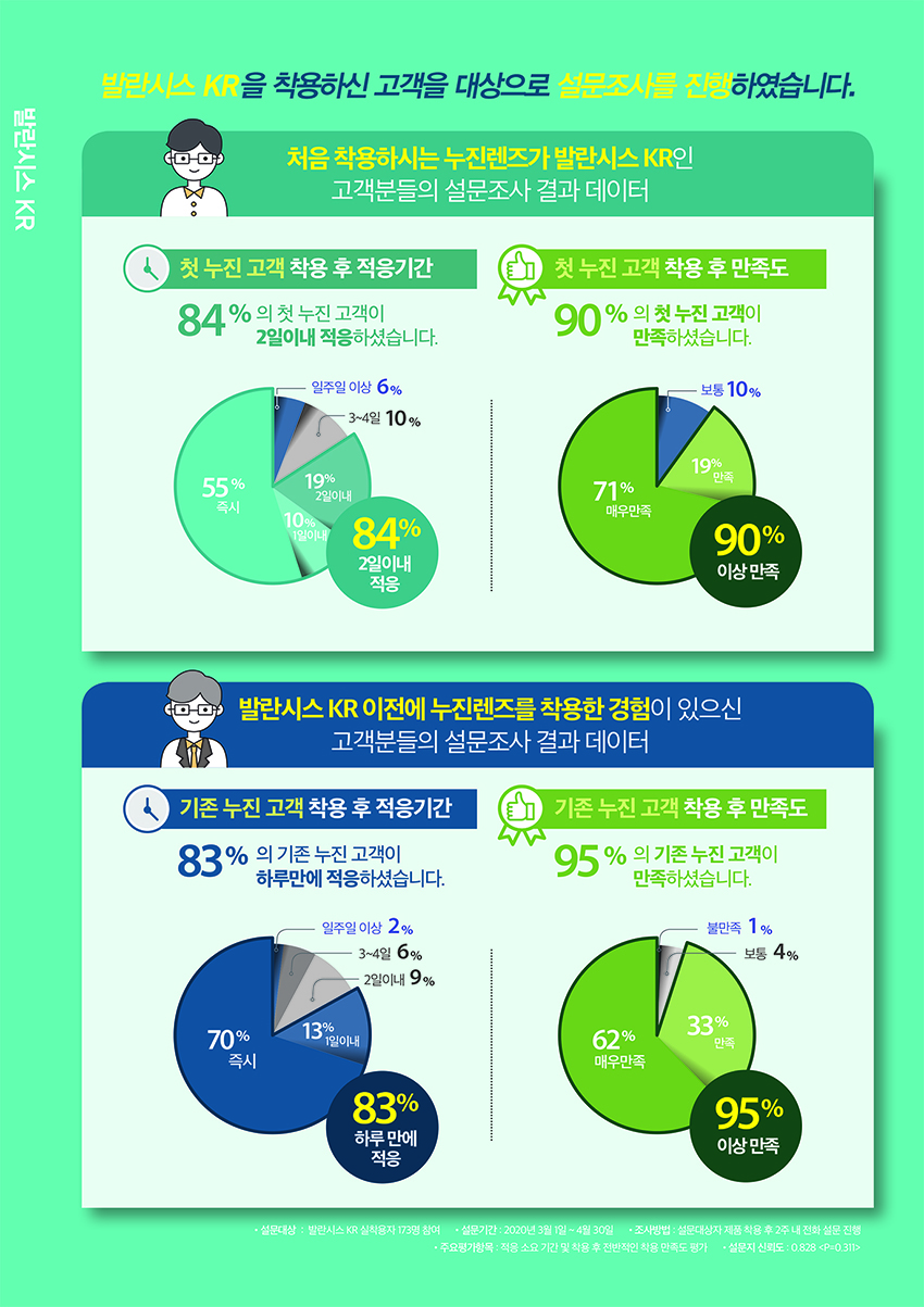 누진렌즈 착용 경험이 있는 응답자들은 즉시 적응했다는 응답이 70%에 달했으며, 하루만에 적응한 응답자만 83%에 이르렀다. 만족도를 묻는 질문에는 95%이상이 만족했다고 답해 발란시스 KR의 제품 완성도를 높이 평가했다.