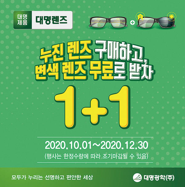 대명광학㈜(대표 정병헌)이 이달 5일부터 12월30일까지 3개월 간 누진렌즈를 구입하는 소비자들에게 무상으로 변색단초점(여벌)렌즈를 증정하는 이벤트를 진행한다고 최근 밝혔다.