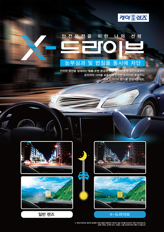 X-DRIVE는 렌즈의 수지(소재)와 코팅 기술로 야간 운전에 불편한 불빛을 부분 차단시켜 눈부심과 번짐 현상을 줄였다. 렌즈는 색깔이 없는 투명한 소재로 개발해 98% 정도의 매우 높은 투과율로 야간 운전에도 뚜렷하고 선명한 시야 확보는 물론 눈의 피로감 또한 줄일 수 있다. 가장 큰 특징으로는 컬러다. 기존의 그린계열 코팅 대신 보라색 계열(VIOLET)코팅을 사용한 이유는 최대시감도가 507nm~555nm인데 이는 그린영역의 파장대라서 그린색 코팅을 하면 이 파장은 받아들일 수 없게 된다. 시각적 정보에 의존해 운전을 하기 때문에 시인성을 높이는 것에 최우선을 뒀다.