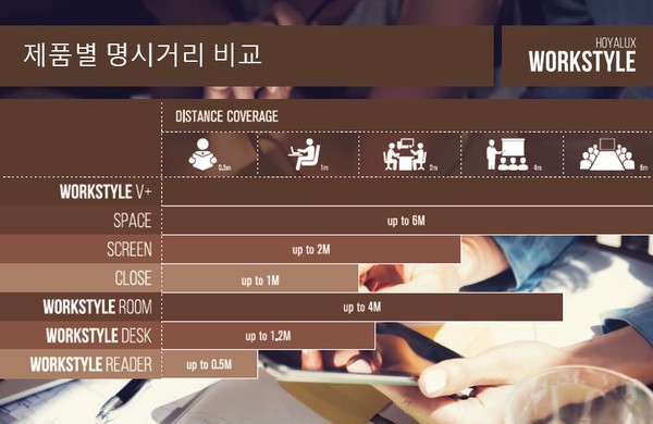 가입도 +2.00이상인 고객들에겐 보다 편안한 디지털 실내 시생활을 위해 호야의 실내용 기능성인 워크스타일 제품군이 최적이다. 워크스타일 패밀리 제품군은 원하는 명시거리에 따라 각 제품별로 최적의 시야를 제공한다. 우선 돋보기의 스마트한 업그레이드형인 워크스타일 리더는 30~80cm를 확보해 근거리 위주의 라이프스타일에 최적화된 제품이다. 워크스타일 데스크는 2가지 타입으로 나뉘는데, A타입은 명시거리 1.2m까지, B타입은 명시거리 2m까지 확보해 소비자의 니즈에 맞춰 근.중거리의 시야를 최적화한다. 워크스타일 룸은 4m까지 명시거리를 확보, 근.중거리뿐만 아니라 원거리 시야도 일부 필요한 소비자에게 적절한 제품이다. 워크스타일 V+는 개인 맞춤 실내용 제품이며 명시거리에 따라 타입이 3가지로 나뉜다. 먼저 V+의 클로즈 타입은 워크스타일 데스크 A타입의 업그레이드형 제품으로 명시거리를 1m까지 확보하며 근거리 작업에 최적인 제품이다. V+의 스크린 타입은 워크스타일 데스크 B타입을 보다 발전시킨 타입으로 명시거리를 2m까지 확보해 높은 활용성을 자랑한다. 마지막으로 V+의 스페이스 타입은 명시거리를 6m까지 확보해 근.중.원거리를 모두 보고자 하는 소비자에게 추천해주기 좋은 프리미엄 실내용 제품이다. 앞서 소개한 제품들과 달리 V+ 제품군은 가입도가 +2.00 이상이더라도 명기된 명시거리 확보가 가능하며 호야가 자랑하는 양면복합설계를 기반으로 한 제품으로 프리미엄 누진 기술이 가미돼 있어 높은 만족도를 자랑하는 제품이다.