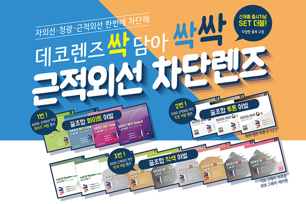 데코비젼(대표 주해돈)은 지난 8월에 출시한 근적외선 차단렌즈인 'DEKO NIR Guard'를 전면으로 내세우고 적극 홍보 중이다. DEKO NIR Guard는 자외선은 물론 청광, 근적외선까지 유해한 3가지 광선을 모두 차단하는 효과를 갖고 있다. 다양한 안질환을 유발하는 등 눈에 해로운 특정 자외선(Ultraviolet Ray), 스마트폰 등 LED 조명에 장시간 노출되면 눈에 해로운 380~480nm의 청색파장, 눈에 보이지 않는 미세한 전기적 파장을 세분화해 망막에 데미지를 주는 근적외선까지 차단된다는 것이다.