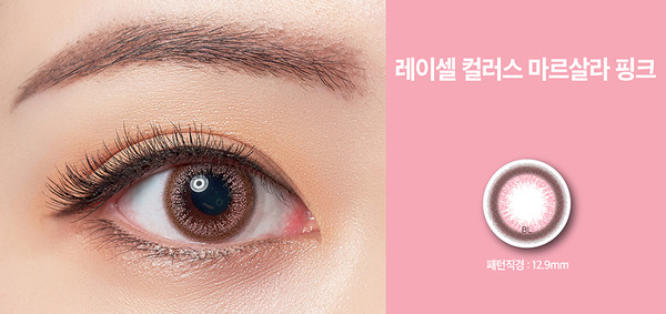 레이셀 컬러스 '마르살라 핑크'는 부드럽고 러블리한 느낌의 컬러렌즈로, 쉬폰 소재룩과 매치해 차분하고 여성스러운 이미지를 완성한다. 숙성된 와인 빛깔 같은 깊은 느낌의 마르살라 컬러와 핑크 컬러의 조합으로 자연스럽고도 사랑스러운 눈빛을 표현할 수 있다.