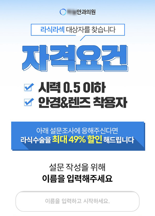 최근에는 가장 대표적인 한 소셜 네트워크에 '당신은 콘택트렌즈 3년 이상 착용하셨나요?'라는 문구로 광고 팝업이 업데이트 됐다. 마치 콘택트렌즈와 관련된 정보를 제공할 것처럼 보이지만 링크를 누르면 한 안과병원이 라식.라섹 수술을 권하는 홍보 페이지가 뜬다. 시력이 0.5 이하거나 안경.콘택트렌즈를 착용하는 사람들이 설문조사를 진행할 경우 최대 49%를 할인해준다는 조건도 내걸었다.