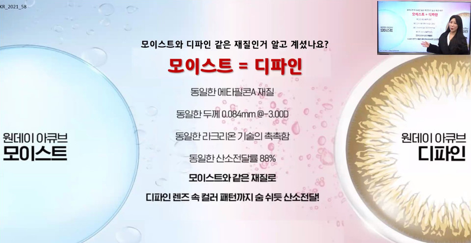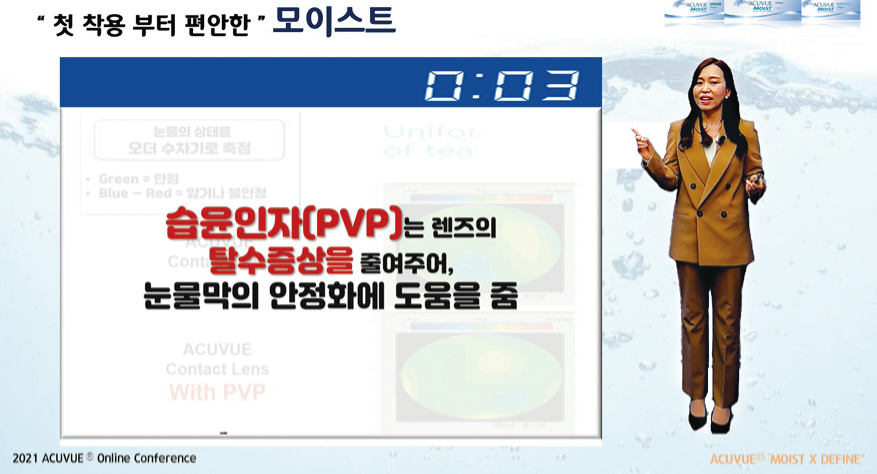 제품에 대한 강연은 아큐브 교육팀(JJI) 황미선 차장과 김송희 과장이 진행했다. 이번 컨퍼런스의 핵심 키워드인 '모이스트와 디파인의 디테일'에 맞춰 두 제품의 강점에 대한 소개가 이어졌다. 황미선 차장은 "우수한 착용감의 기준은 낮은 경도, 습윤인자 기술, 낮은 표면 마찰계수, 적절한 함수율 등 4가지 조건을 들 수 있다"며 "모이스트는 0.27mpa 낮은 경도로 다른 하이드로젤 재질에 비해 두 배 정도 낮다. 또 함수율이 높을수록 산수투과성이 높아질 수 있지만 단백질 침전이 증가하고 핸들링이 어려워진다. 모이스트는 58%의 적절한 함수율을 갖고 있다"고 설명했다.