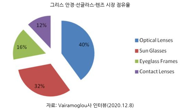 그리스 아테네 무역관은 안경 수입사인 Vairamoglou사의 Mr. Papadakis 대표와 인터뷰를 통해 그리스의 안경 및 선글라스 시장 규모는 약 2억5000만 유로라고 밝혔다. 특히 안경렌즈의 경우 그리스 내 자체 생산규모가 매우 미미하기 때문에 수입에 의존하는 유통구조를 띄고 있으며 중국산 제품을 중심으로 수입 중이다. 안경렌즈 시장규모는 약 1억 유로, 선글라스는 8000만 유로, 안경 프레임은 4000만 유로, 콘택트렌즈 시장 규모는 3000만 유로로 추정된다. Mr. Papadakis 대표는 그리스 내 안경 렌즈를 가공하는 곳은 약 10여곳인데 2017년부터 렌즈 수량이 조금씩 증가하는 추세였다가 작년 코로나로 전년대비 15% 감소를 예상했다.
