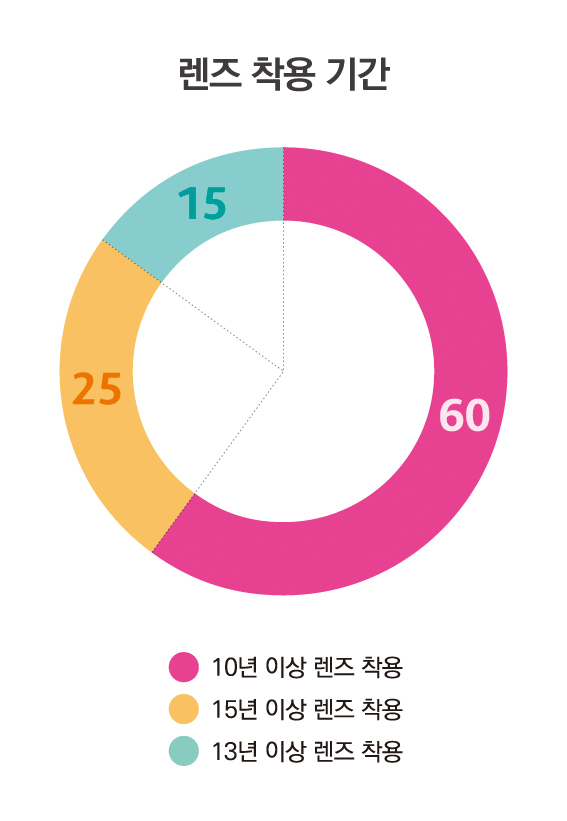 300명 중 콘택트렌즈를 10년 이상 착용한 응답자는 60%, 15년 이상 착용자는 25%, 13년 이상 착용자는 15%로 나타났다. 국내에 실리콘 하이드로겔 렌즈가 판매되기 시작한지 약 20년 정도이고 헤마 재질의 렌즈는 실리콘보다 더 오래됐기 때문에 그에 비하면 상대적으로 10년 이상 착용은 그리 길지는 않다. 다만 제품에 대한 불만족이나 시력교정수술 같은 외부요인으로 인해 콘택트렌즈를 중도포기하는 사례가 적지 않기 때문에 국내 콘택트렌즈 시장을 활성화하는데 견인차 역할을 했다고 볼 수 있다.