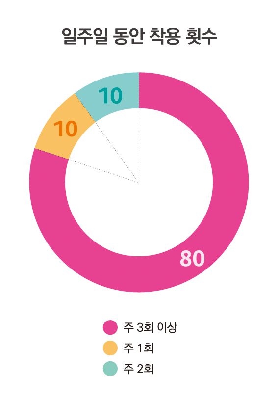 그렇다면 일주일에 렌즈를 착용하는 횟수는 얼마나 될까. 주3회 이상 착용한다고 답한 응답자가 약 80% 정도로 압도적이었으며 주1회와 주2회는 각각 10% 정도다. 설문조사를 한 시기가 코로나로 인해 외출을 자제하고 비대면 산업이 활성화 됐기 때문에 콘택트렌즈를 착용하는 횟수가 많지는 않다. 직장인들 경우에도 재택근무가 늘어나면서 콘택트렌즈 보다는 안경 착용 횟수가 더 늘어나게 된 것.