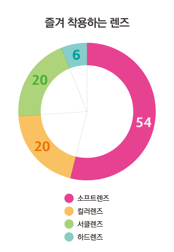 주로 착용하는 렌즈 종류도 소프트렌즈가 54%였으며 컬러렌즈 서클렌즈는 각각 20%, 하드렌즈는 6%의 응답률을 보였다.