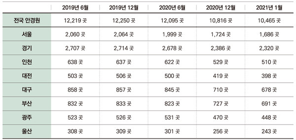 가장 눈에 띄는 변화는 전국적으로 동일하게 안경원 수가 감소했다는 것이다. 그동안의 수치를 살펴보면 경제상황이 좋지 않더라도 지역별로 안경원이 증가하는 곳도 있고 그대로 유지하는 경우도 적지 않았다. 그러나 올해 1월 수치를 보면 서울, 경기를 비롯한 8개 도시 모두 최소 3%에서 최대 6% 감소한 것을 알 수 있다. 퍼센트 수치로만 보면 소폭하락으로 보일 수 있지만 불과 2020년 12월과 2021년 1월 즉, 한 달 사이에 이 정도 수치가 하락한 것은 안타까운 상황이다.
