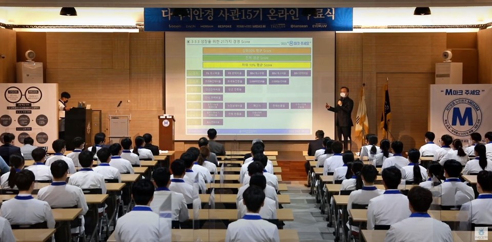 이어 "21가지의 스코어 전략은 지금 이 자리에 있는 사관생도들과 가맹점이 풀어가야 할 부분"이라며 "하위 10%에 있는 안경사들을 평균치로, 평균치 안경사들을 상위 30%로 올리는 것이 21가지 경영 스코어 정책의 목표"라고 강조했다.