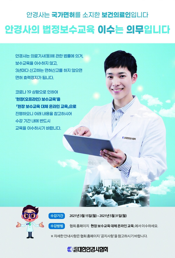 코로나19 상황으로 인해 온라인 교육으로 대체된 2021년도 안경사 법정보수교육이 이달 31일 종료된다.