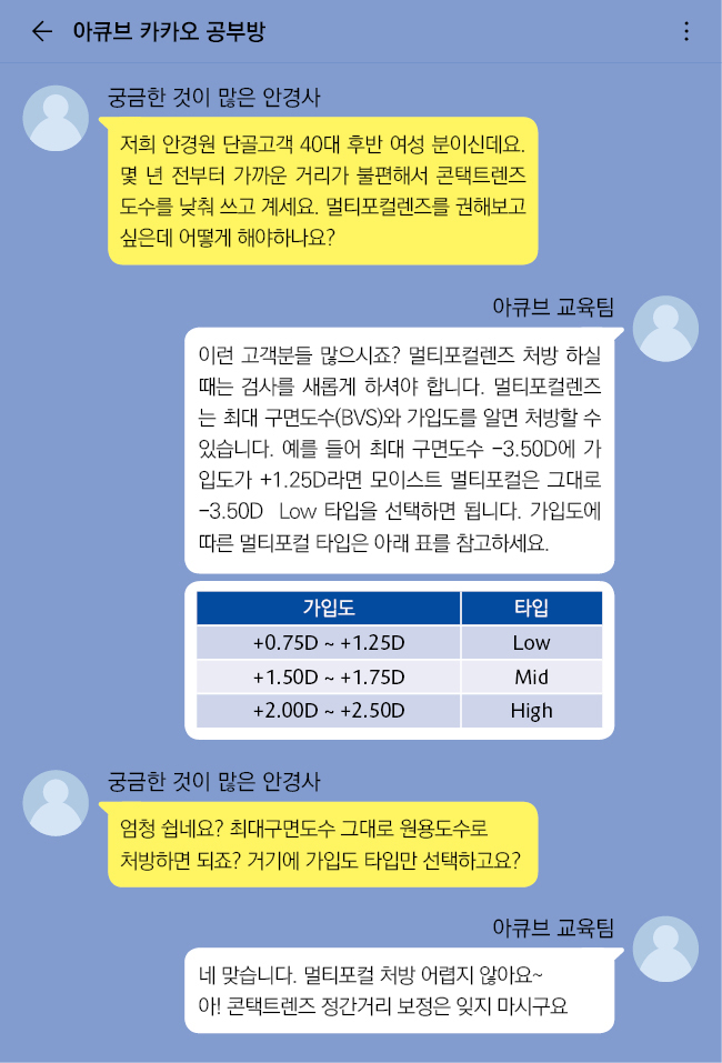fn아이포커스와 한국존슨앤드존슨 비젼 아큐브 교육팀이 함께하는 카카오톡 공부방이 열렸습니다. 평소 안경사 분들이 많이 질문하셨던 내용을 카카오톡 형태로 재구성했습니다. 아큐브교육팀에 질문하고 싶으신 내용이 있으면 fneyefocus@fneyefocus.com으로 문의 바랍니다.