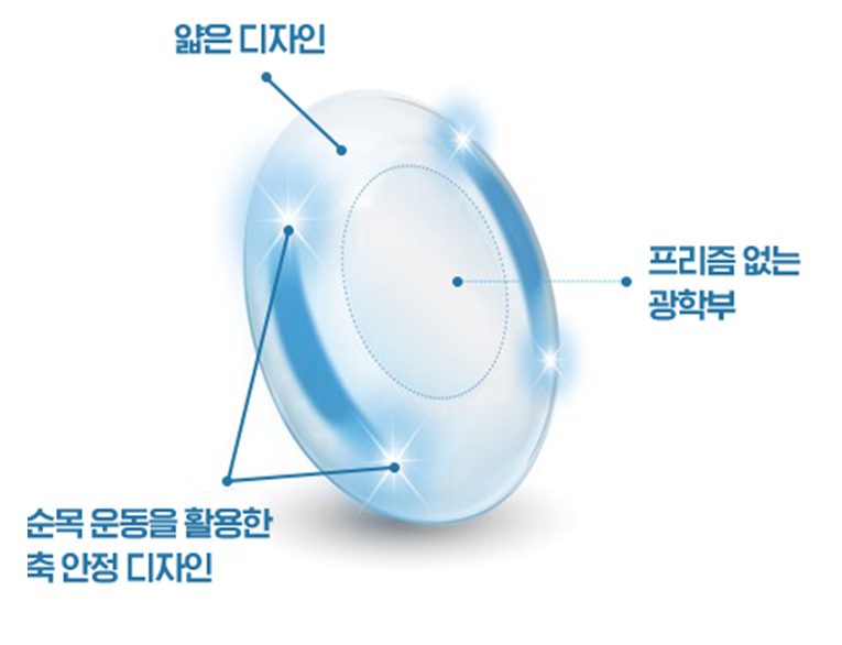 두 번째로 상.하안검에 닿는 부위가 얇아 착용감이 우수하고 눈을 움직일 때 안검과의 마찰이 적어 주시방향 변화에도 안정적이다.