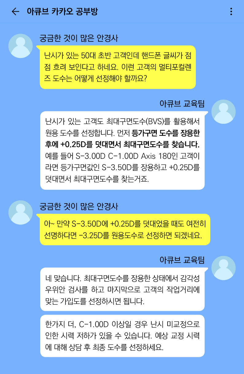 fn아이포커스와 한국존슨앤드존슨 비젼 아큐브 교육팀이 함께하는 카카오톡 공부방이 열렸습니다. 평소 안경사 분들이 많이 질문하셨던 내용을 카카오톡 형태로 재구성했습니다. 아큐브교육팀에 질문하고 싶으신 내용이 있으면 다음 메일로 문의 바랍니다. fneyefocus@fneyefocus.com