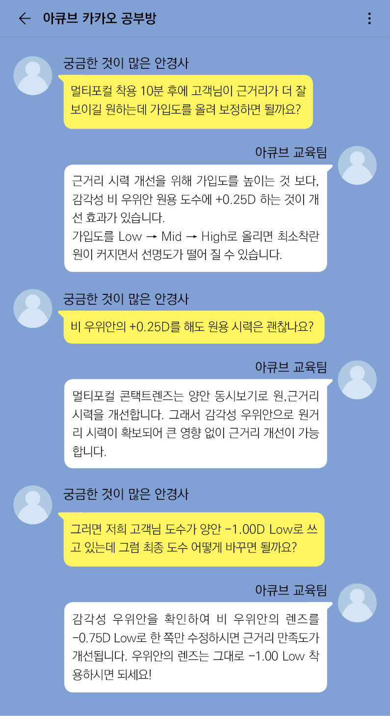 fn아이포커스와 한국존슨앤드존슨 비젼 아큐브 교육팀이 함께하는 카카오톡 공부방이 열렸습니다. 평소 안경사 분들이 많이 질문하셨던 내용을 카카오톡 형태로 재구성했습니다. 아큐브교육팀에 질문하고 싶으신 내용이 있으면 다음 메일로 문의 바랍니다.  fneyefocus@fneyefocus.com